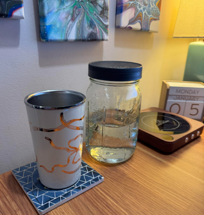 This combo works better for me. It’s not even 8:00 AM, and I’ve already had 16 oz of water. My goal is to finish one mason jar before I have my coffee.